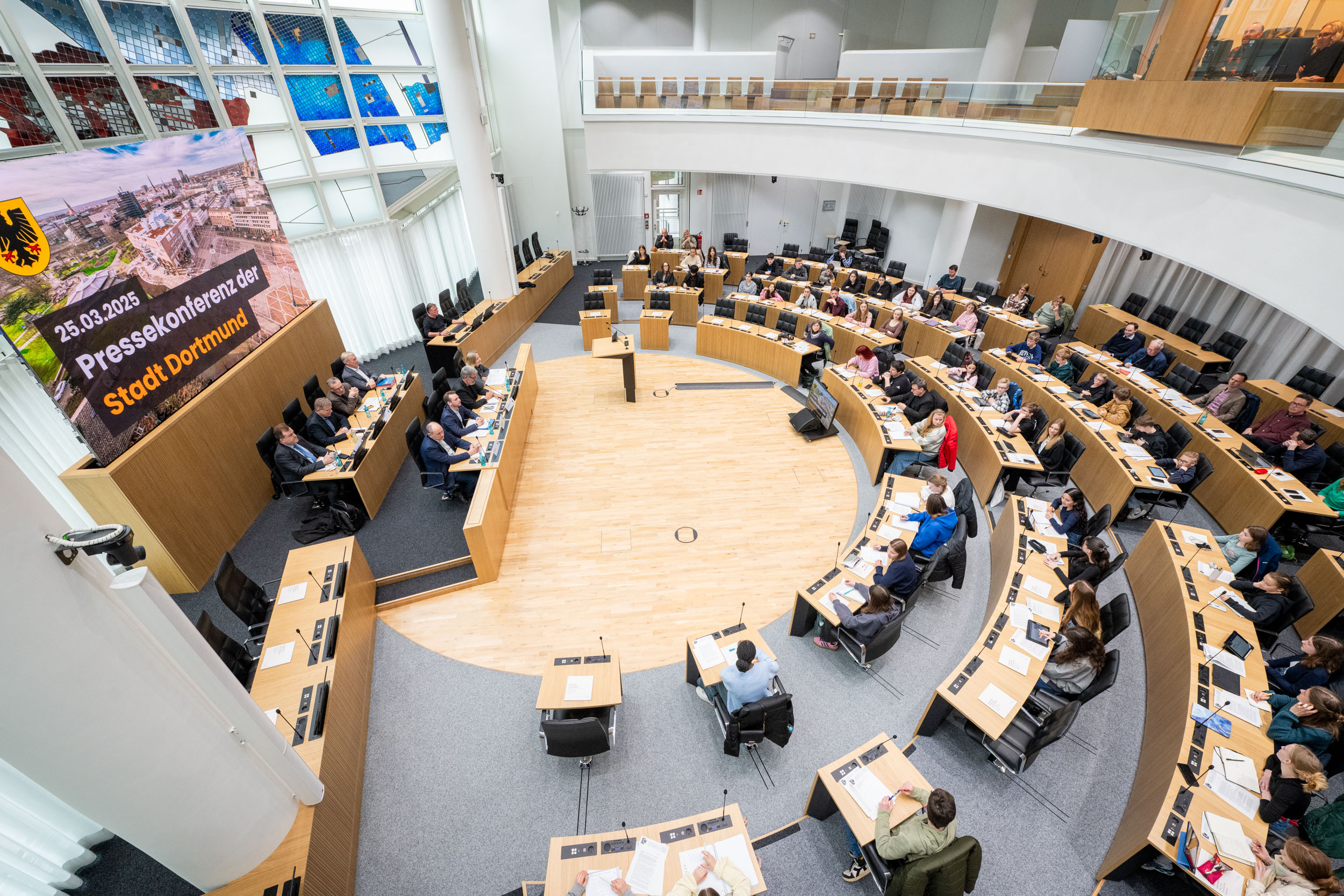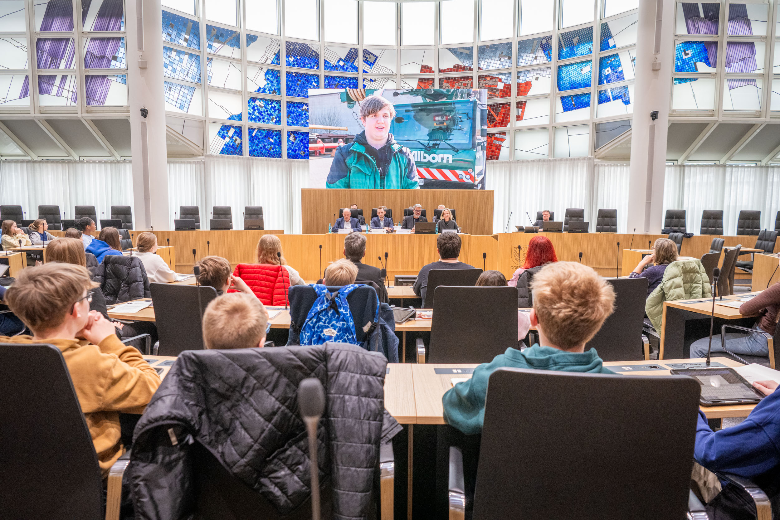 Statt auf dem Pausenhof saßen die Schüler von sieben Dortmunder Schule beim Verwaltungsvorstand und löcherten den Oberbürgermeister und die Dezernent*innen mit ihren Fragen.