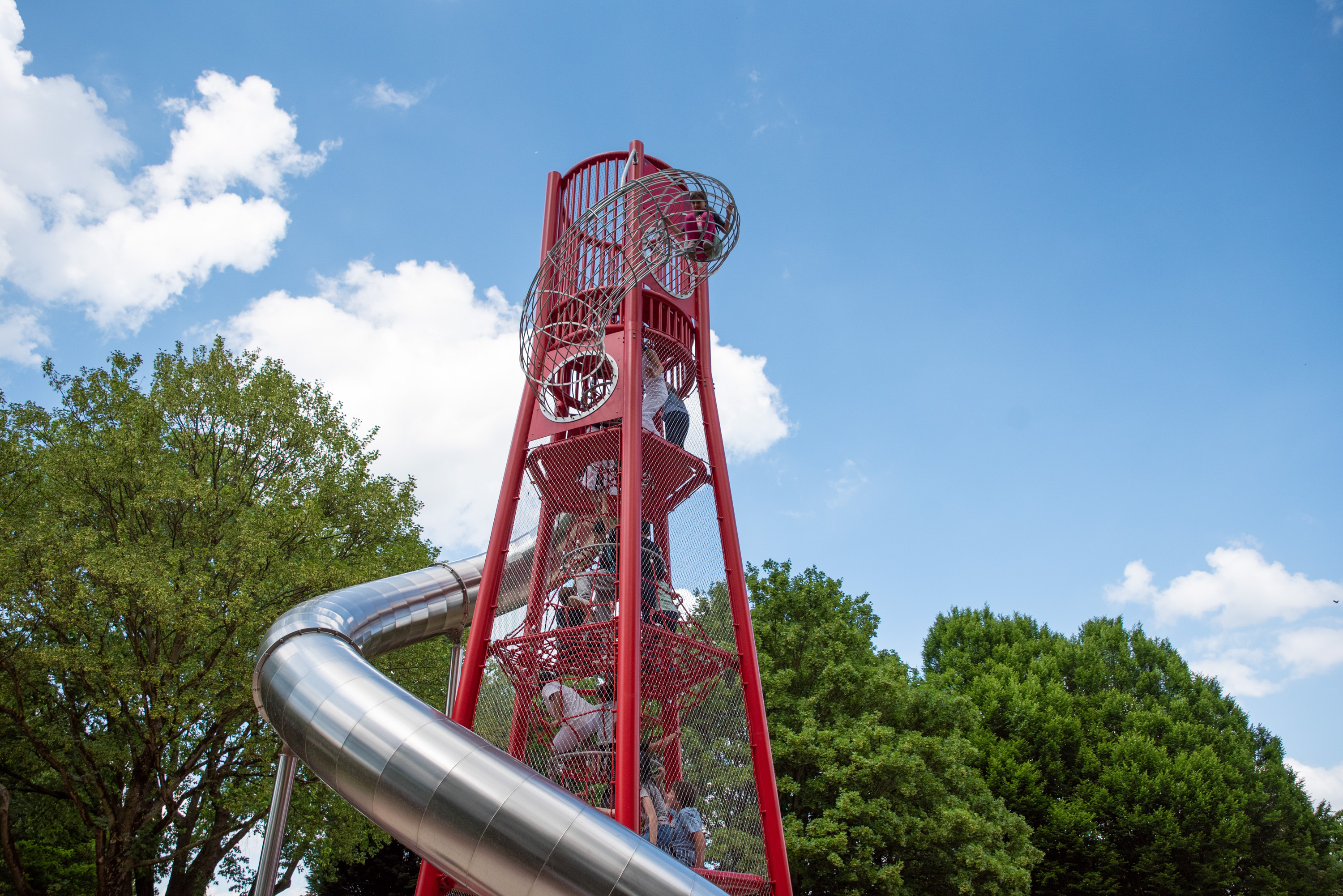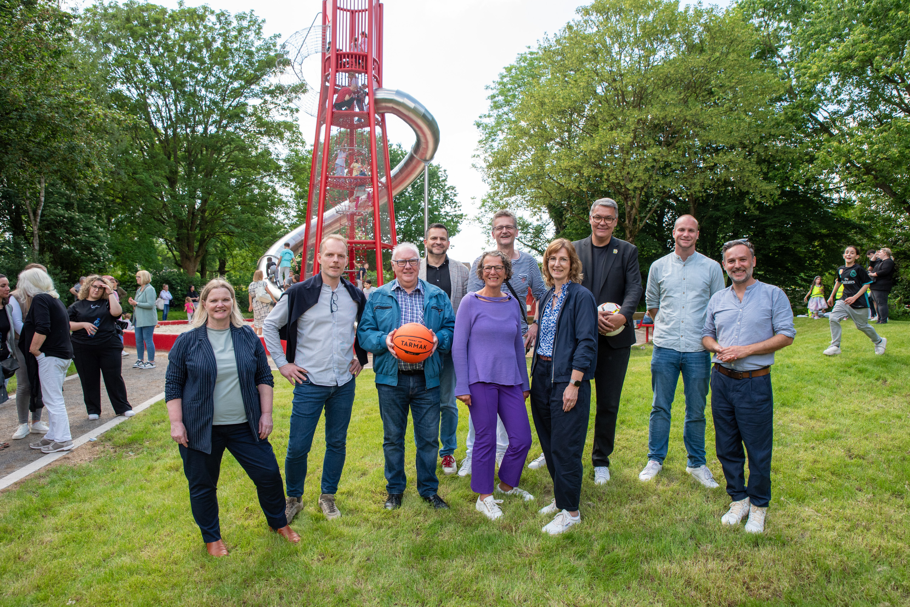 Highlights der neuen Spielachse sind ein großzügiger, moderner Basketball- und Fußballplatz und ein Kletterturm auf dem Spielplatz an der Varziner Straße. Er erinnert an einen Förderturm und ist schon von Weitem zu sehen.