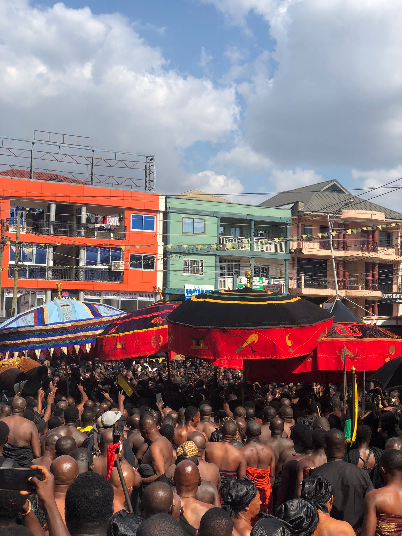 Große Ehre für die Dortmunder Delegation: Zum Abschluss des ersten Tages in Kumasi erlebten die Gäste auf Einladung die royale Beerdigung des hohen ghanaischen Würdenträgers Akyempem Hene. Er war der Schildträger des Ashanti-Königs und in der vergangenen Woche verstorben.