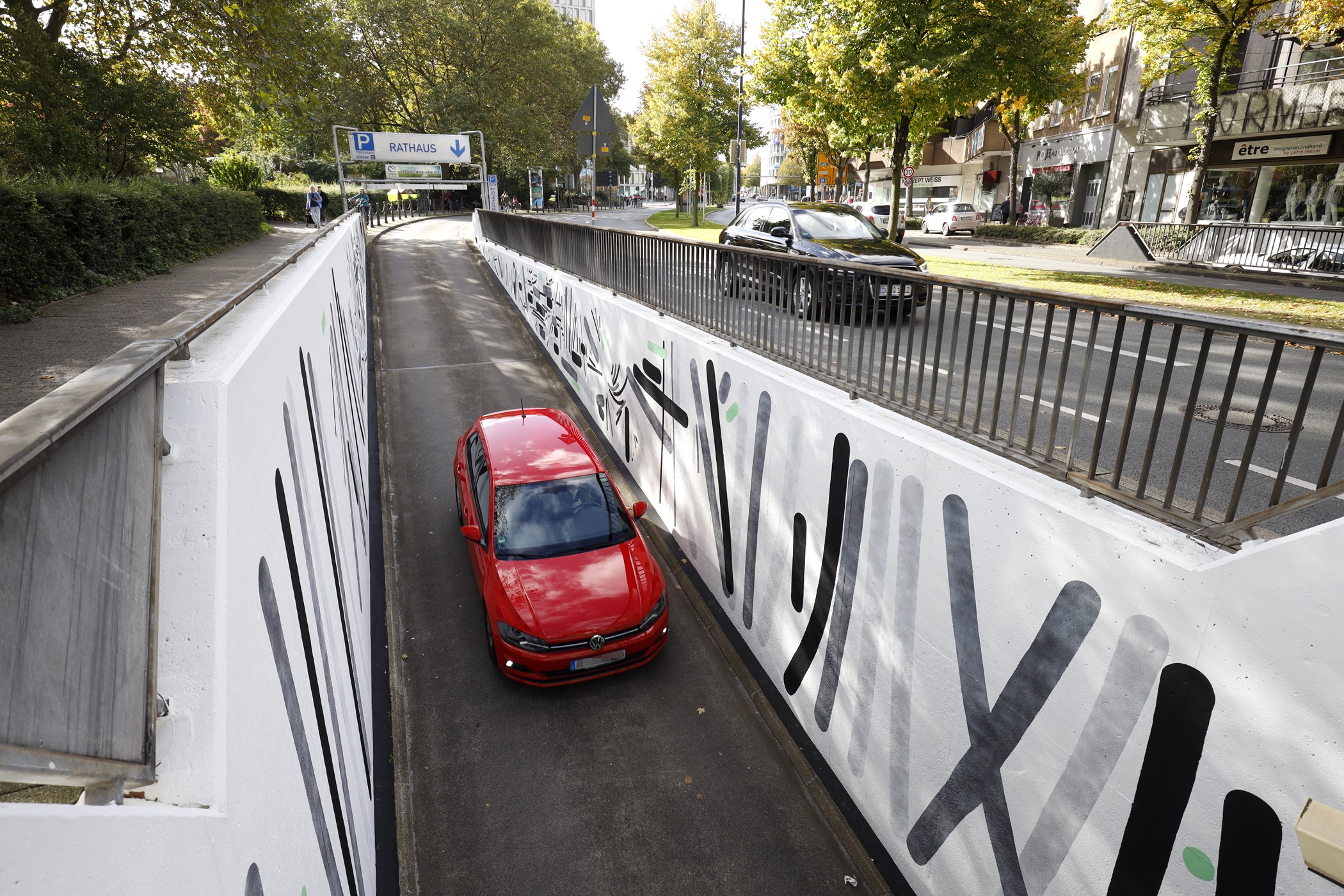 Das gilt auch für das ebenfalls schwarz-weiß-graue Werk von Lea Carla Diestelhorst, fast nebenan an der Ludwigstraße 8–10. „Hier schwingt mehr Bewegung mit“, erklärt Daniela Bekemeier von 44309//GALLERY, die das Projekt begleitet hat. „Ihre Zeichnungen sind naturalistisch inspiriert.“ Bekemeier ist Initiatorin und Kuratorin von Street-Art. Sie bietet auch Führungen zur Urban Art im öffentlichen Raum an – häufig durch das Unionviertel, das sich zum weiteren Street-Art-Hotspot entwickelt hat. Manchmal gibt es übrigens auch Fördermittel für die großflächige Kunst: Lea Carla Diestelhorst etwa hat neben der Fassade in der Ludwigstraße gerade im Auftrag der Stadt Dortmund auch die Ein- und Ausfahrt der Tiefgarage am Rathaus gestaltet – dafür gewährte das Land einen Zuschuss.