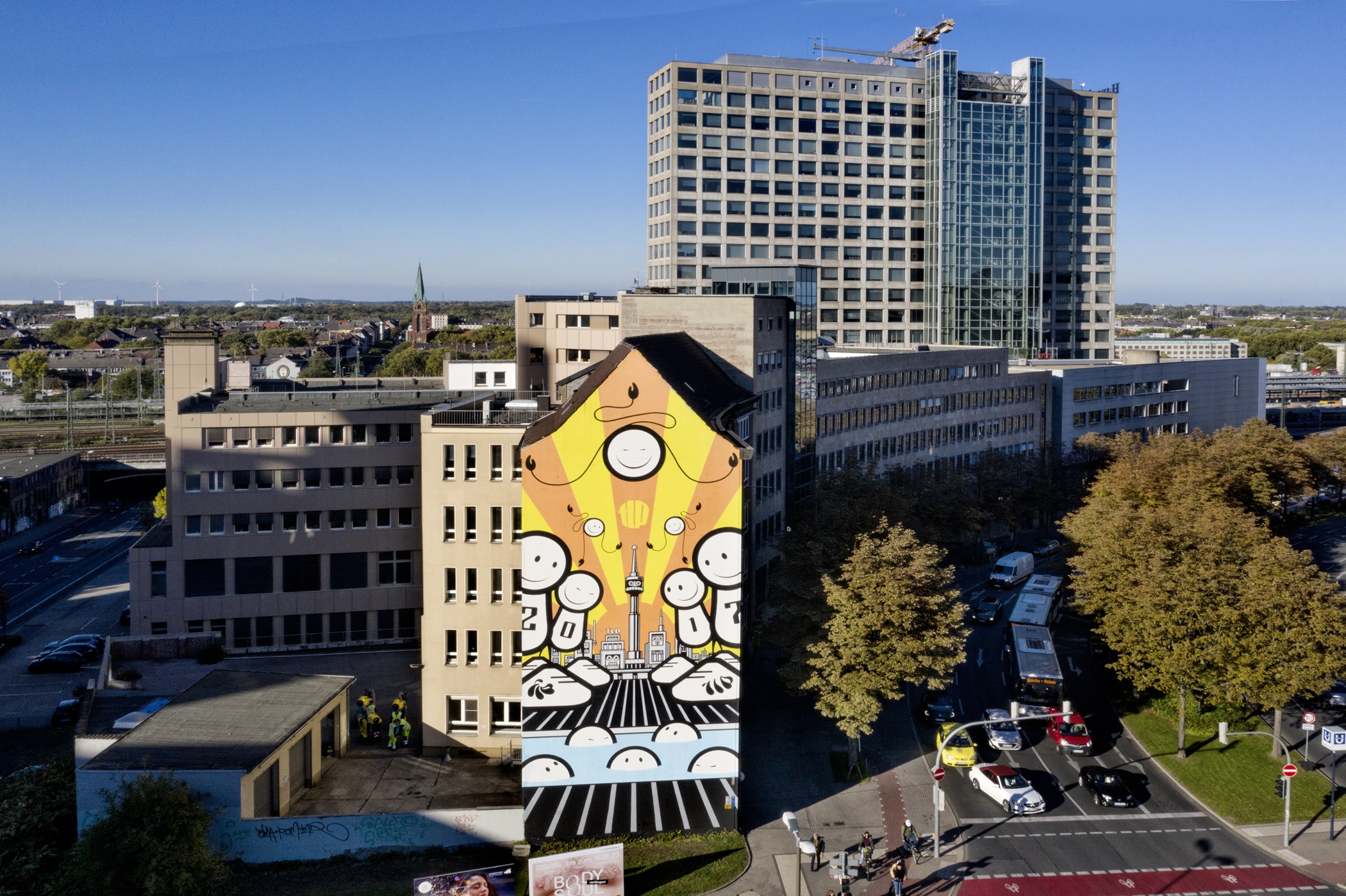 Um Kunst an Fassaden zu bringen, braucht es natürlich immer auch überzeugte Hauseigentümer*innen. Denn bei den Murals handelt es sich zumeist um beauftragte Arbeiten, die den öffentlichen Raum prägen – langfristig oder vorübergehend. Ein Kunstwerk auf Zeit ist etwa das Mural an der Kreuzung Königswall / Brinkhoffstraße. Das farbenfrohe Wandbild (s. Bilderstrecke oben) zeigt comicartig die Dortmunder Skyline aus figurativen Gebäuden im unverwechselbaren Stil des Künstlerkollektivs „The London Police“ aus Amsterdam. Im Vordergrund ihr Markenzeichen – die sogenannten „LADS“ – in Schwarz-Weiß mit dem Entstehungsjahr des Kunstwerks auf der Brust. Mit dem Neubau der VHS an dieser Stelle wird das Kunstwerk verschwinden – doch neue Street-Art wird weitere Fassaden erobern und bereichern.