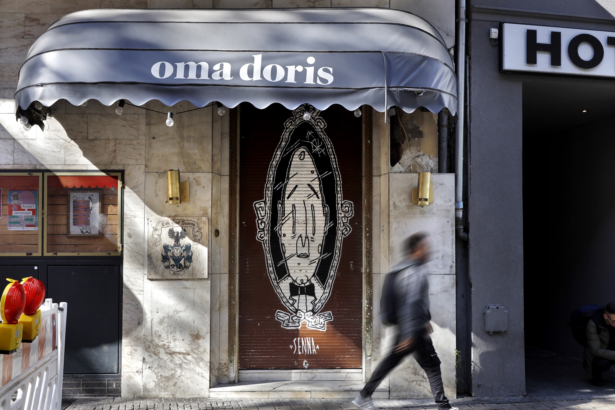 Zurück im Brückviertel begegnet man in der Reinoldistraße einem Werk des Brasilianers Alex Senna, das 2014 spontan zustande kam. Auf dem Tür-Rollo des Clubs Oma Doris präsentiert sich in Schwarz-Weiß sein „Alter Mann im Spiegel“. „Senna arbeitet oft geschickt mit Licht und Schatten, und bezieht seine Werke in die Umgebung ein – das sehen wir auch hier“, erklärt Daniela Bekemeier.